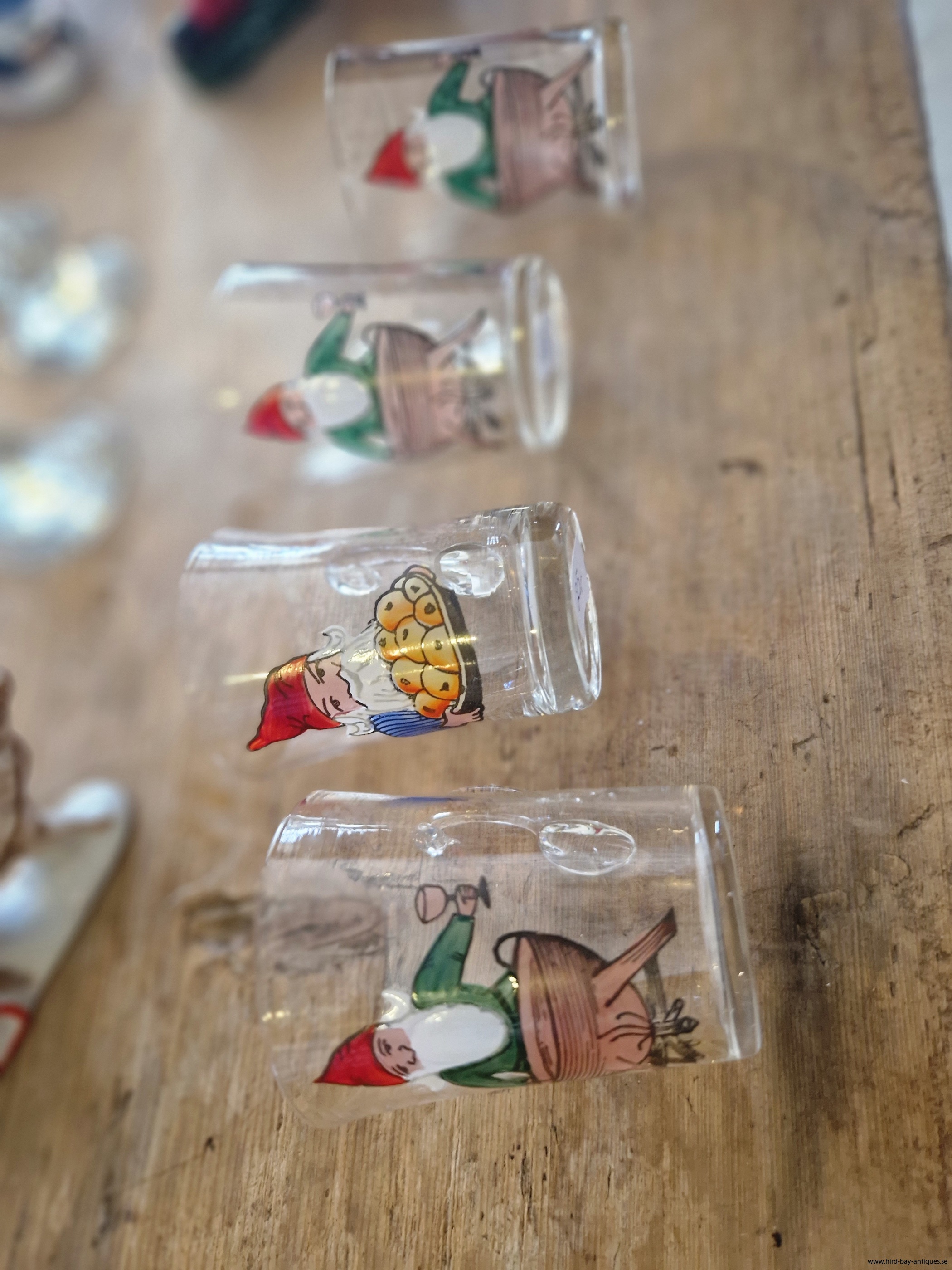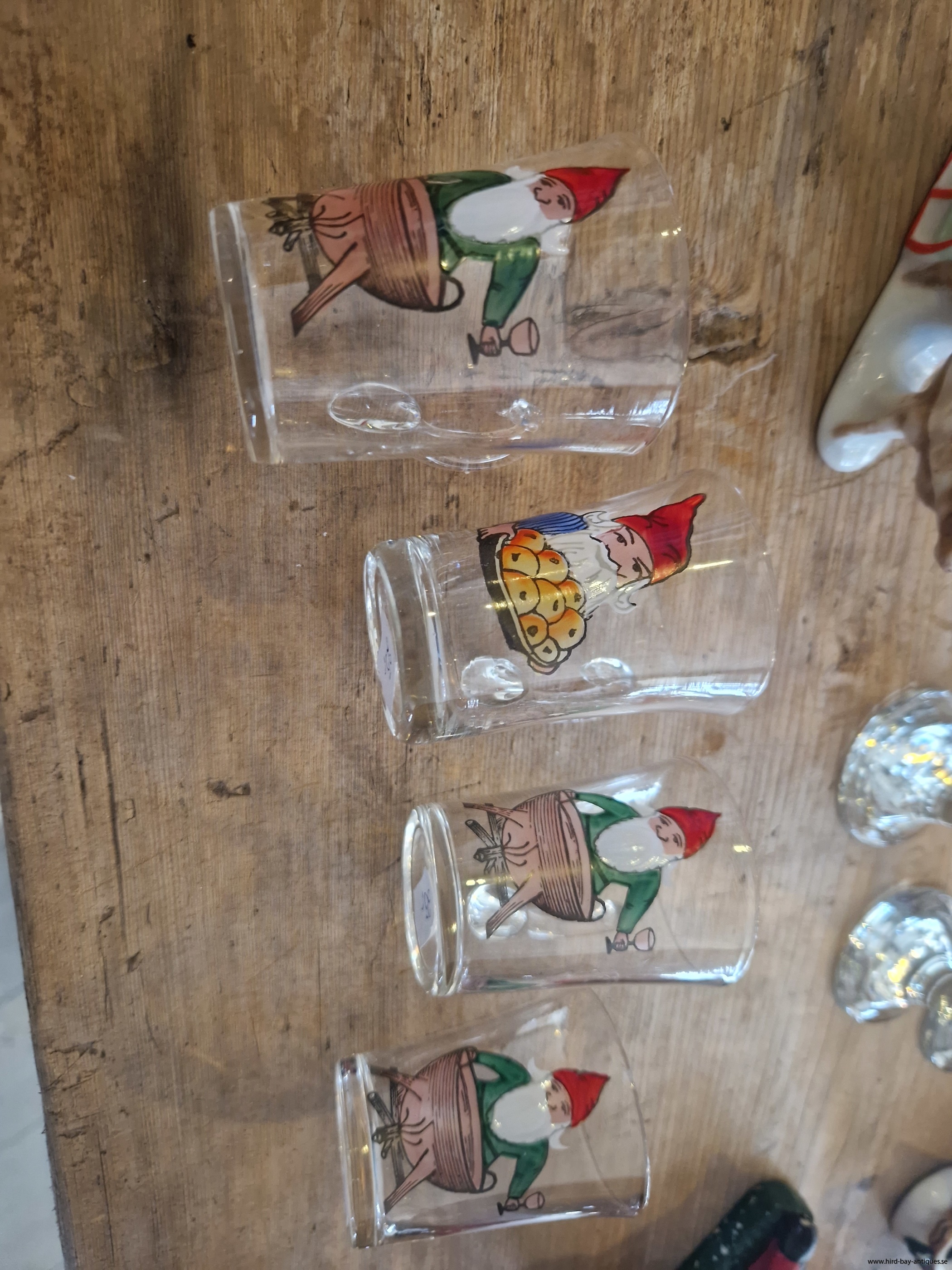 gamla handmålade glöggmuggar med tomtemotiv
